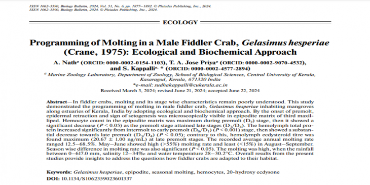 In fiddler crabs, molting and its stage wise characteristics remain poorly understood. This study demonstrated the programming of molting in male fiddler crab, Gelasimus hesperiae inhabiting mangroves along estuaries of Kerala, India by adopting ecological and biochemical approach. By the onset of premolt, epidermal retraction and sign of setogenesis was microscopically visible in epipodite matrix of third maxilliped. Hemocyte count in the epipodite matrix was maximum during pre-molt (D2) stage, then it showed a significant decrease (P < 0.05) as the pre-molt stage attained late stages (D3/D4). The hemolymph total protein increased significantly from intermolt to early premolt (D0/D1) (P < 0.001) stage, then showed a substantial decrease towards late premolt (D3/D4) (P < 0.05); contrary to this, hemolymph ecdysteroid titre was found maximum (20.67 ± 1.00 ng/mL) at late premolt stages. The recorded average annual molting rate ranged 12.5–68.5%. May–June showed high (>55%) molting rate and least (<15%) in August–September. Season wise difference in molting rate was also significant (P < 0.05). The molting was high, when the rainfall between 0–617.0 mm, salinity 12–34‰ and water temperature 28–30.2°C. Overall results from the present studies provide insights to address the questions how fiddler crabs are adapted to their habitat.